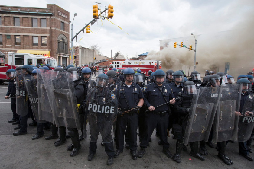 La policía forma en line en frente al incendio de un edificio durante las protestas por la muerte de Freddie Gray en Baltimore, Maryland (Foto: EPA / Michael Reynolds)